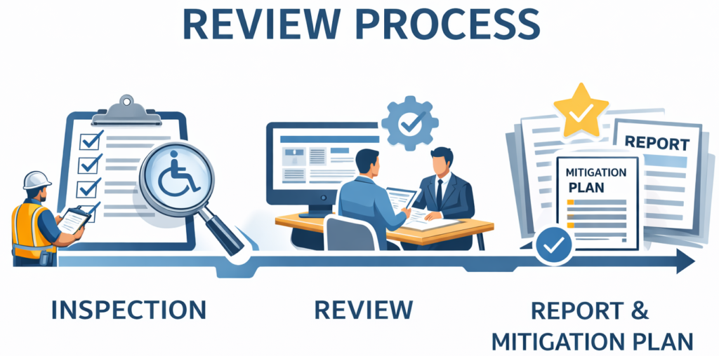 The true value of our service lies in our structured Review Process, where our engineers, ADA Coordinators, Registered Accessibility Specialists and Risk Management Specialists carefully analyze the data collected during inspection within the broader context of your business operations, property structure, and regulatory obligations.